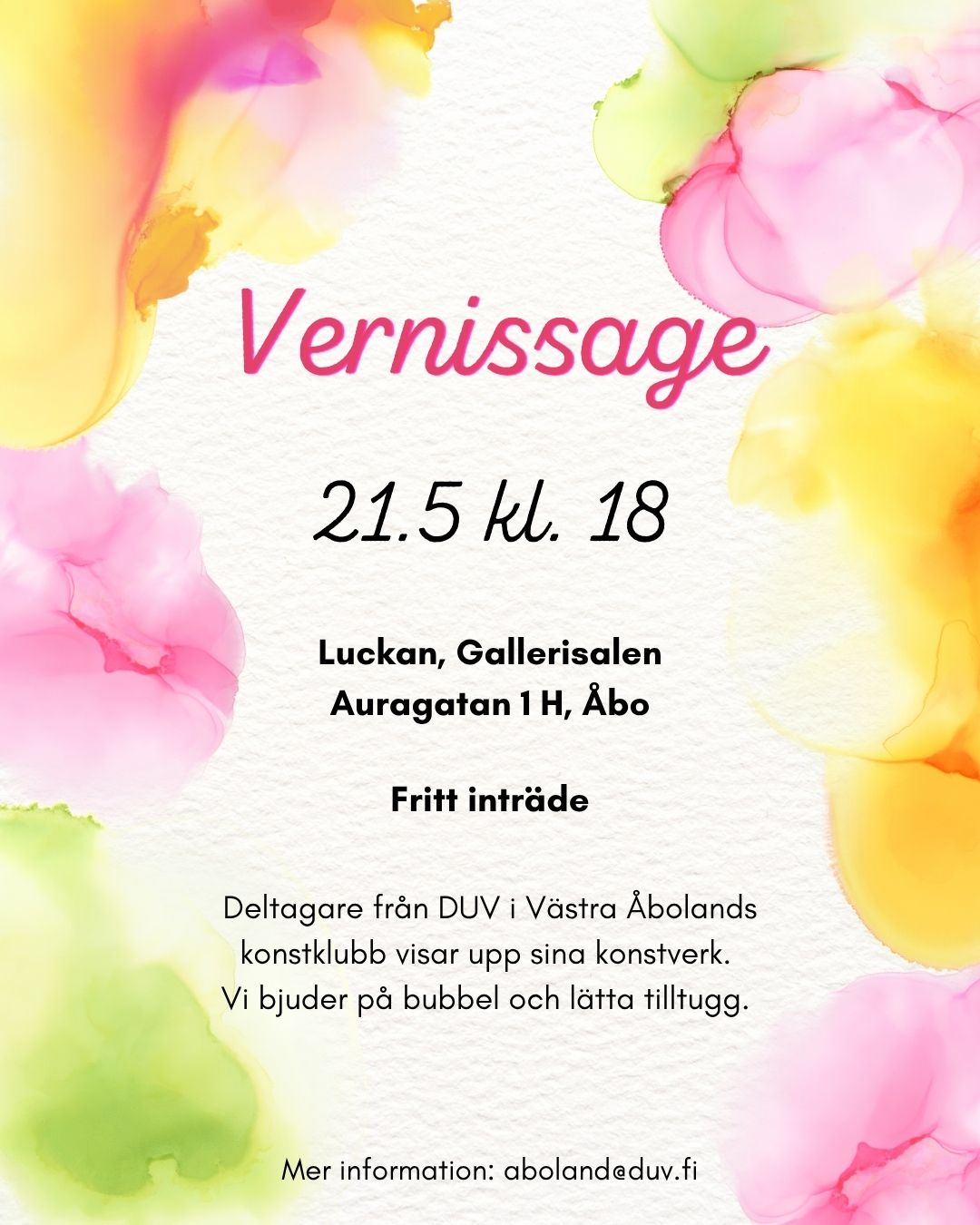 Deltagarna i DUV:s konstklubb visar upp vad de har skapat under terminens gång. Kom och titta på konst, mingla och ha det trevligt! Vi bjuder på lättare tilltugg och ett glas bubbel.
